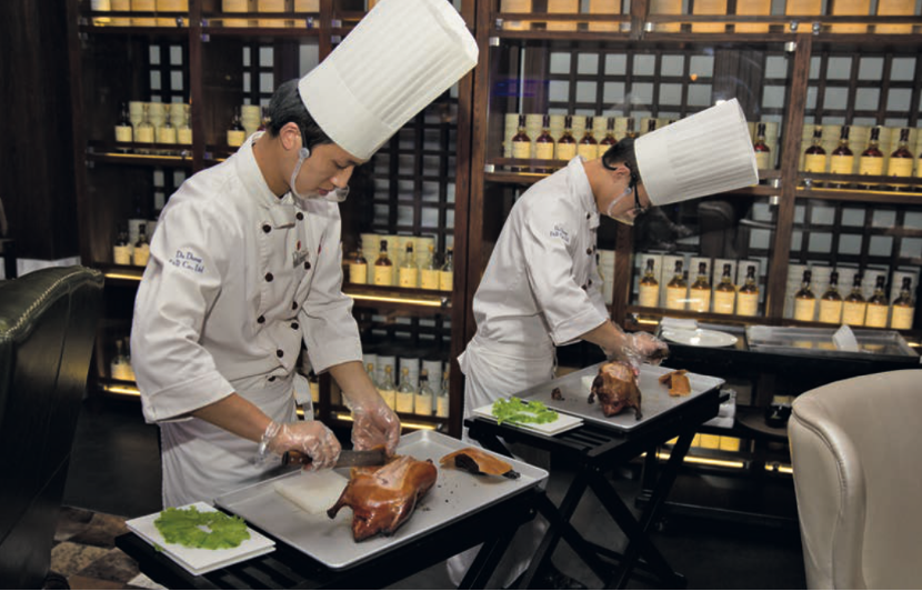 烤鸭有两种口味选择:传统的一种是搭配海鲜酱,另一种是搭配鱼子酱。