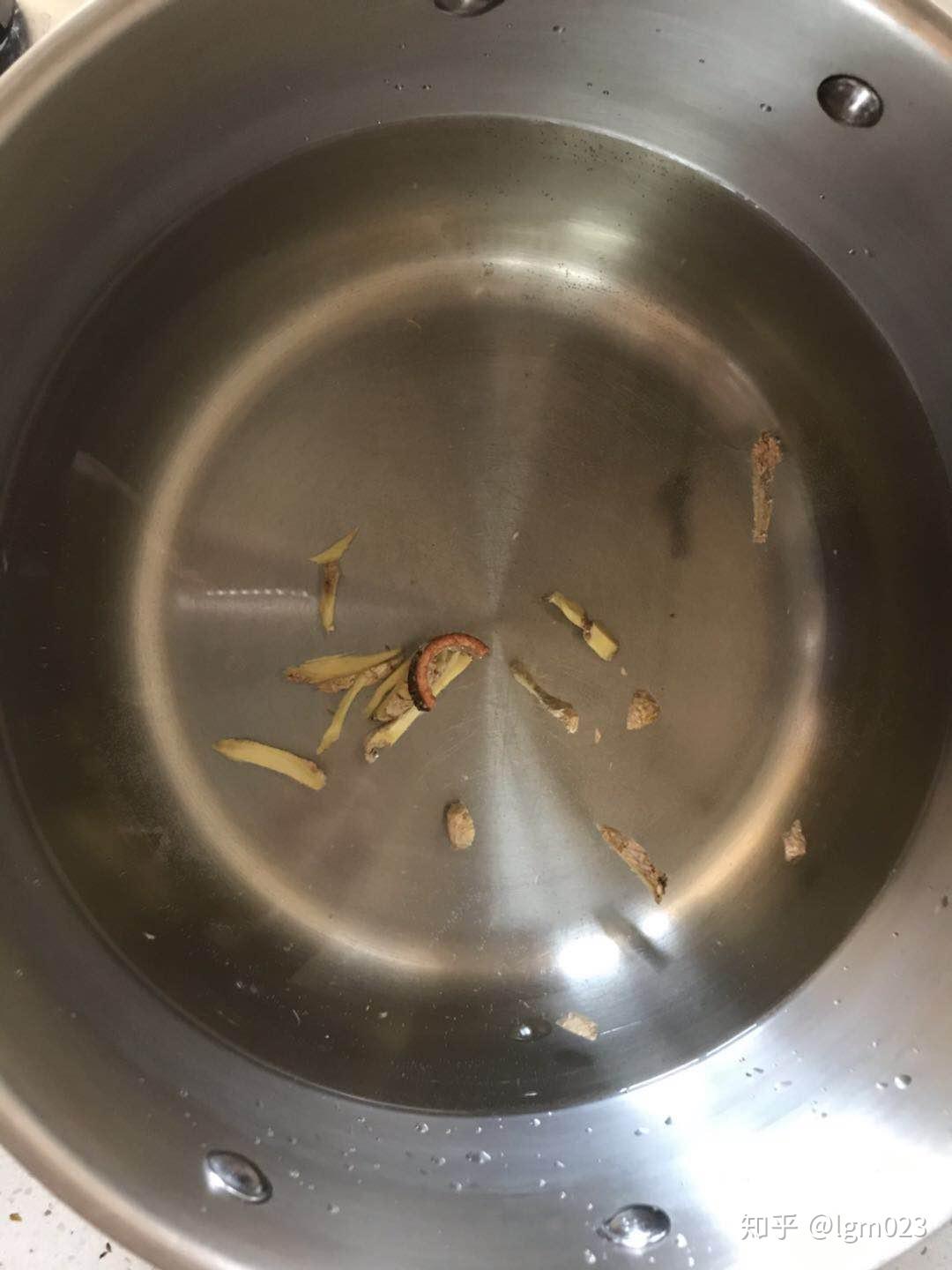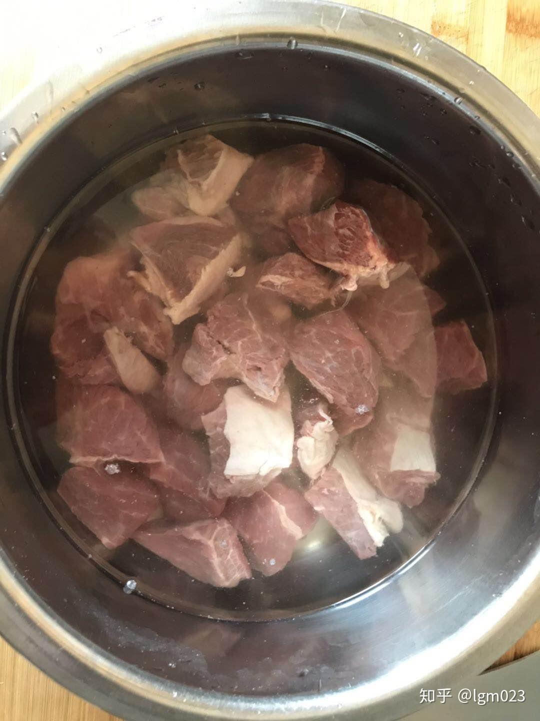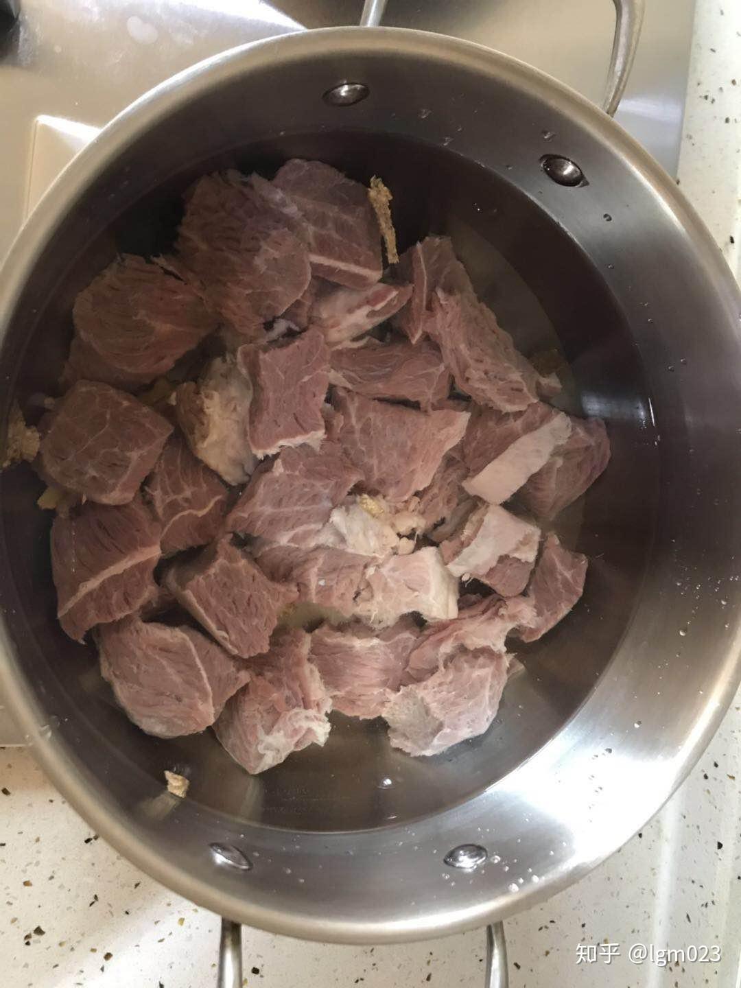2、冷水焯肉。在锅里加入冷水,放入一些姜片,滴入一些料酒,把牛肉块倒进去,大火烧煮,烧开后撇去血沫。(注意要用冷水焯牛肉,若用热水,牛肉会瞬间缩紧,血沫就出不来了。)烧开大约5分钟后,将牛肉块捞出备用。这一步主要是去除牛肉中的血沫和腥味。
