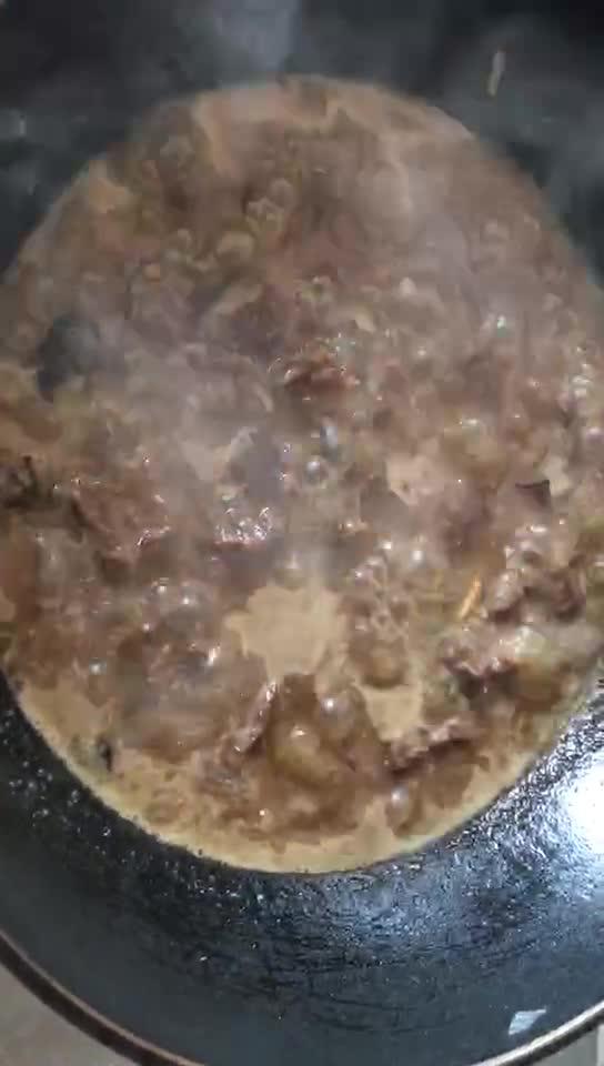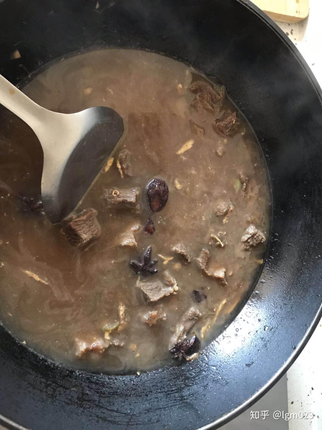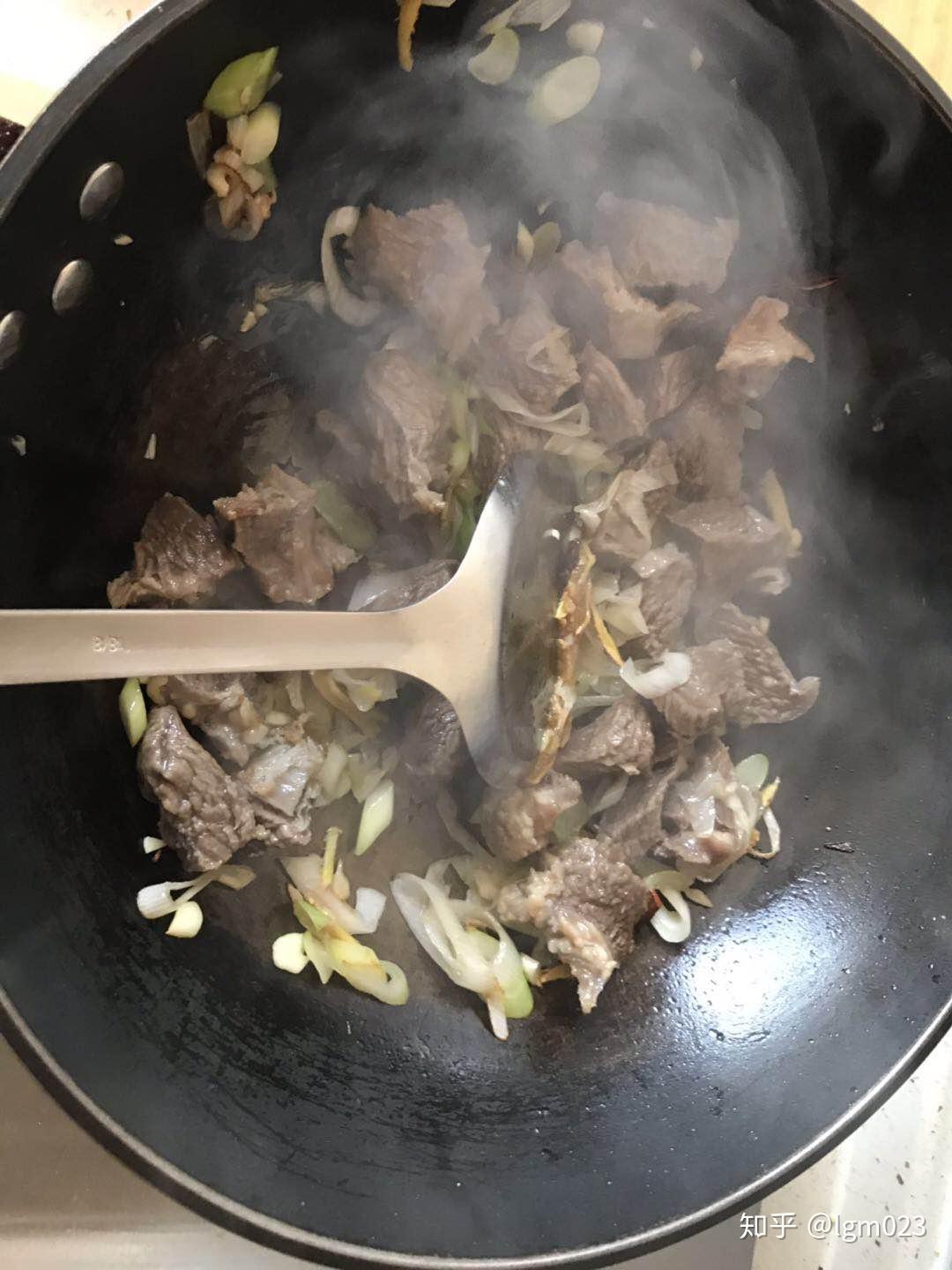 5、加水慢炖。大火快炒几分钟后,加入清水(水量要多,要完全将牛肉块浸没其中),小火慢慢炖,估计需要2到3小时,所以水不能少。