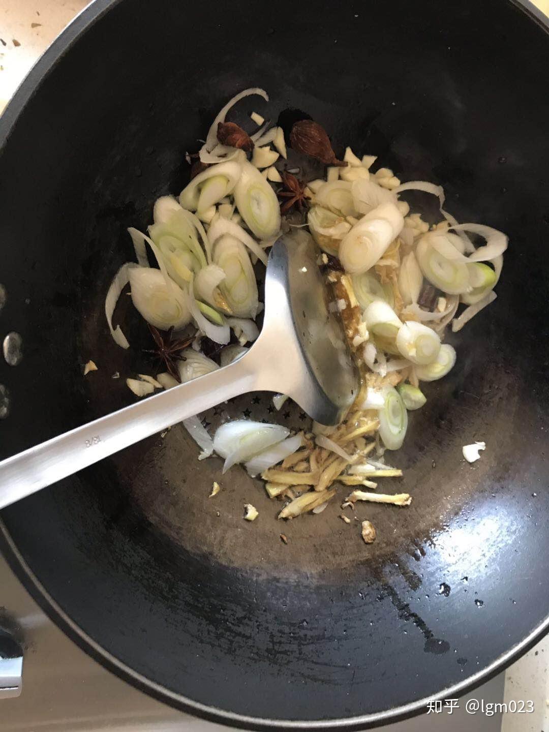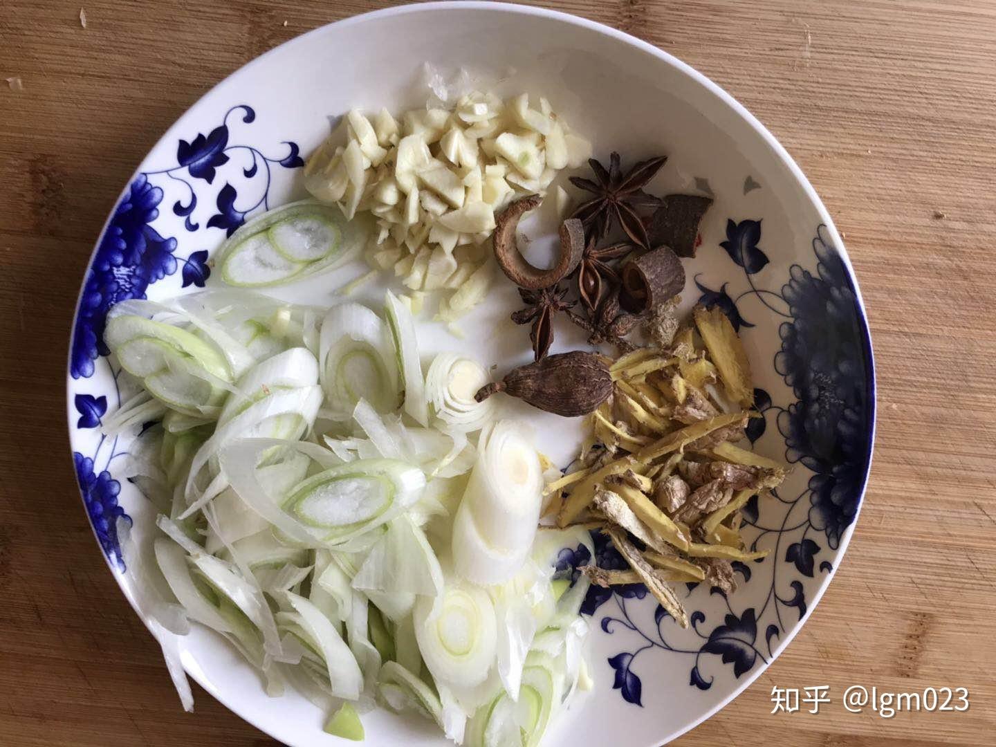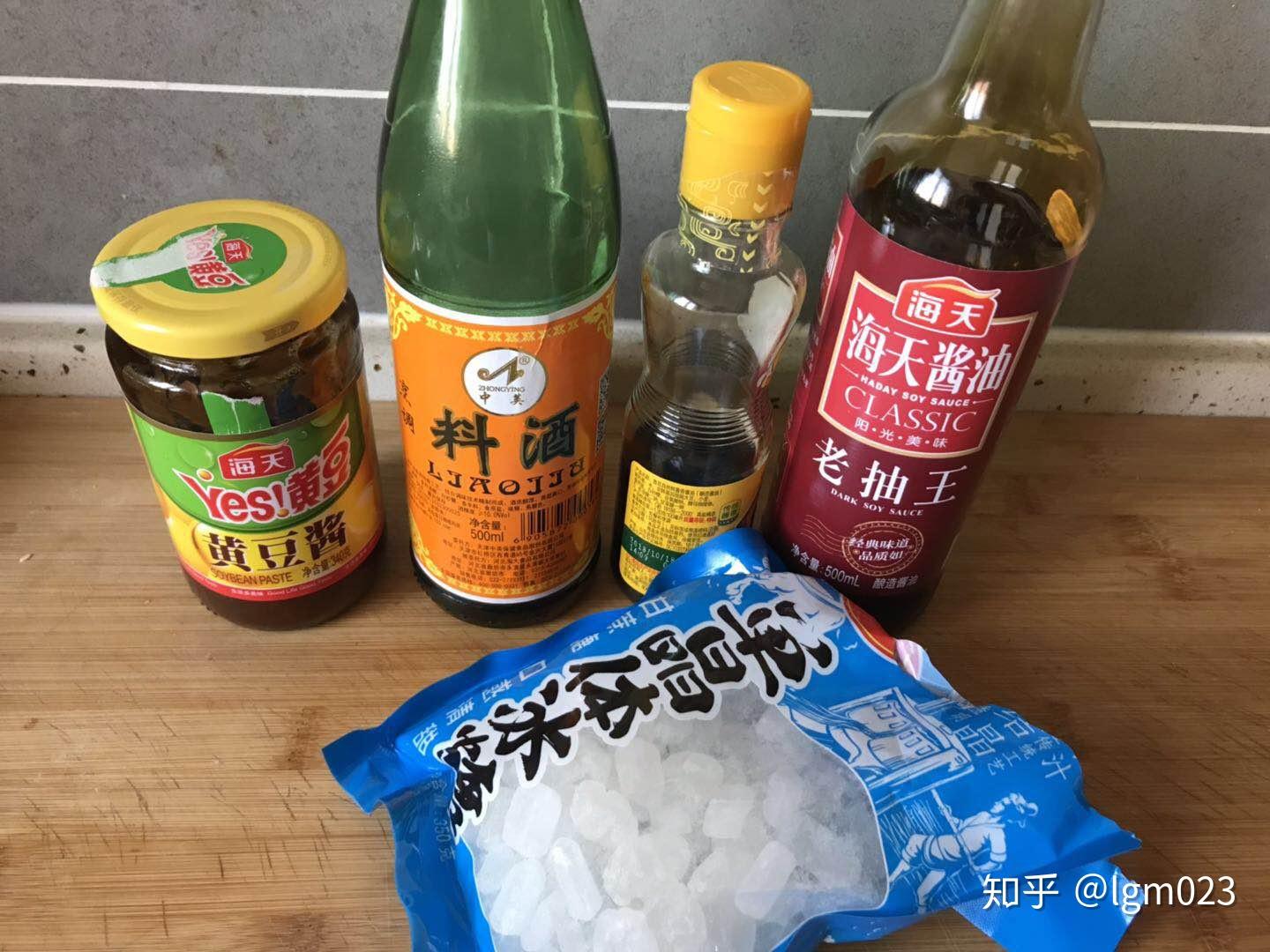 配料:葱片、姜片、蒜片、八角、桂皮、料酒、生抽、黄豆酱(也可用豆瓣酱)、冰糖(或白糖)、食盐(可少用,也可不用,生抽黄豆酱中已有咸味)、食用油