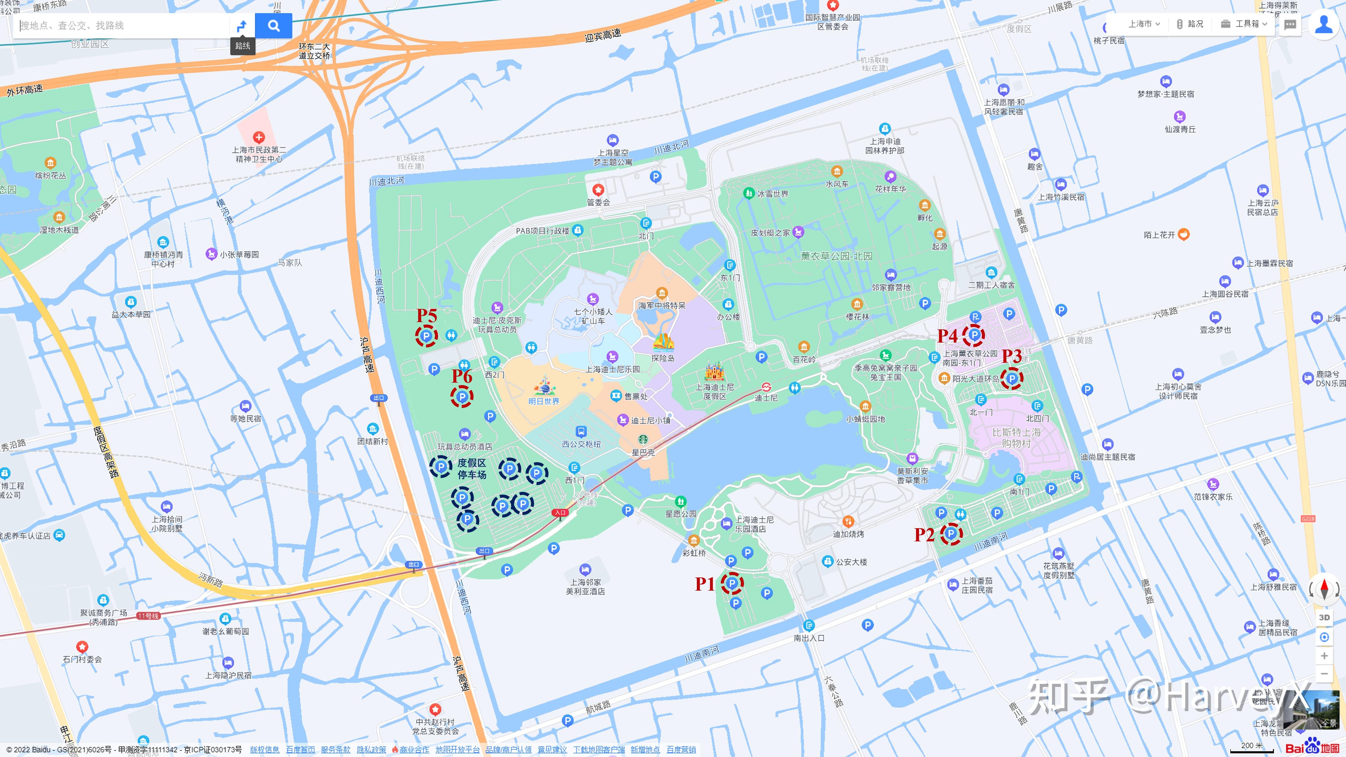 推荐停靠迪士尼度假区停车场(图中蓝色框),尽量靠近西公交枢纽。