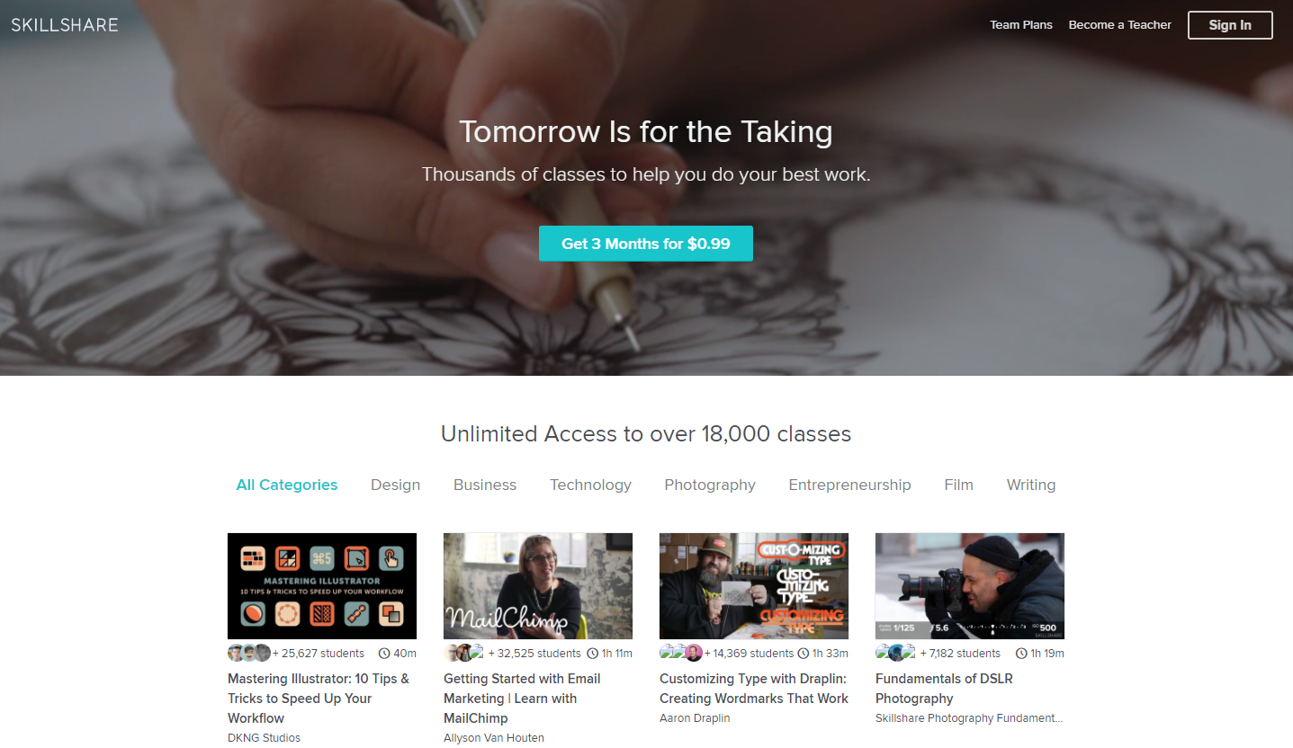 如果是为了技能培训的话,skillshare是一个不容错过的在线培训网站。涵盖了包括设计、商业、科技、摄像、企业管理、创业、电影和写作等全方面的技能视频培训课程。你可以根据所需要提高的技能,有针对性的选择课程。这个在线教育网站比较有特点的是,“Learning by doing”,也就是说你可以在课程中参与到某些特定的项目或小组,在实践中提高自己的技能水平。