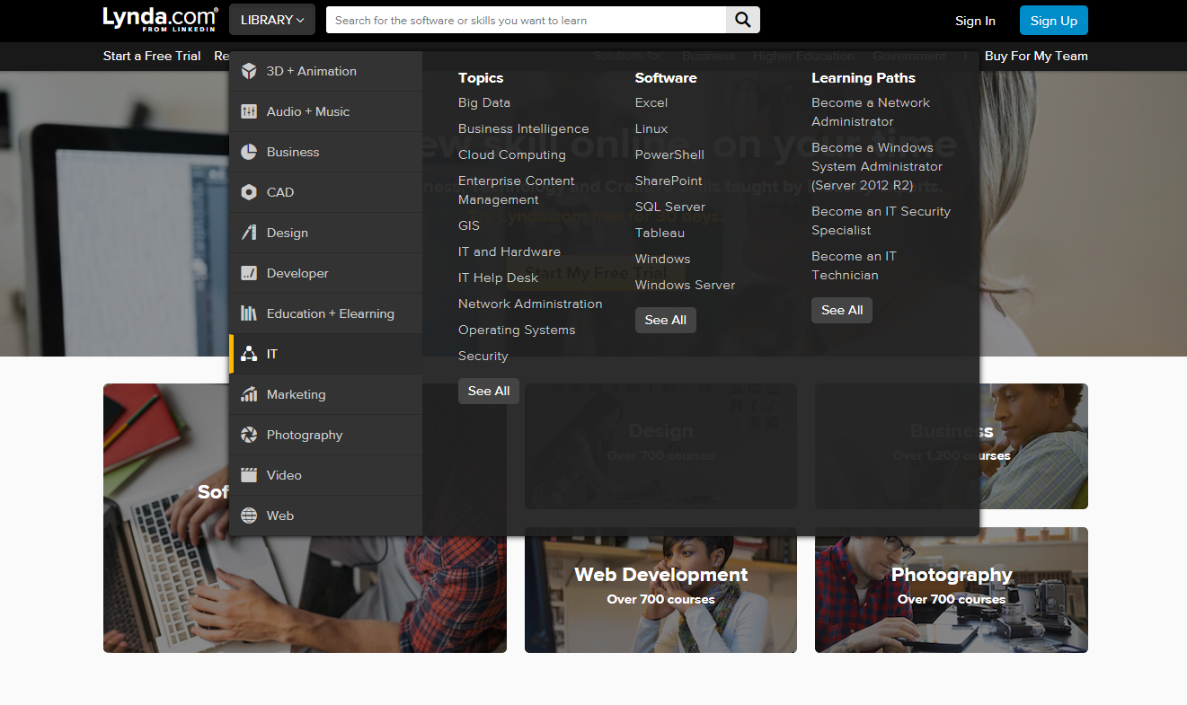 Lynda是一家超过20年的老牌在线课程学习平台,涵盖的课程非常丰富。你可以从各个类别中,通过选择“主题”“应用的软件”与“成长路径”进行课程的选择。比如说在“开发者”类目中,你可以“主题”,如游戏,桌面应用,手机应用进行课程选择,也可以通过你正在所使用的“软件工具”,如C,OC,Ruby,iOS等来选择,更棒的是,你还能通过“成长路径”,如成为云开发工程师,iOS9工程师等等来配置你的课程。