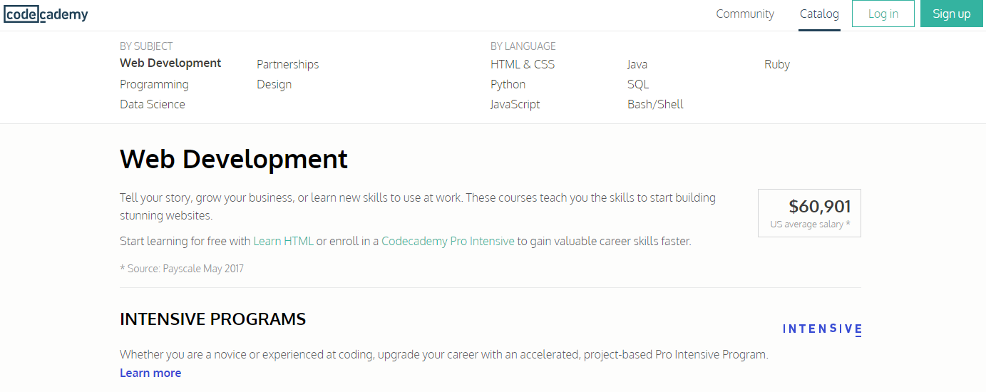 Codecademy是一个免费的在线开发学习平台。因为是免费,所以涵盖的开发语言种类并不多,包括PHP,Phython, Java, SQL, Bash/Shell 和Ruby。对于初学者来说,是一个不错的入门级的国外在线教育平台。
