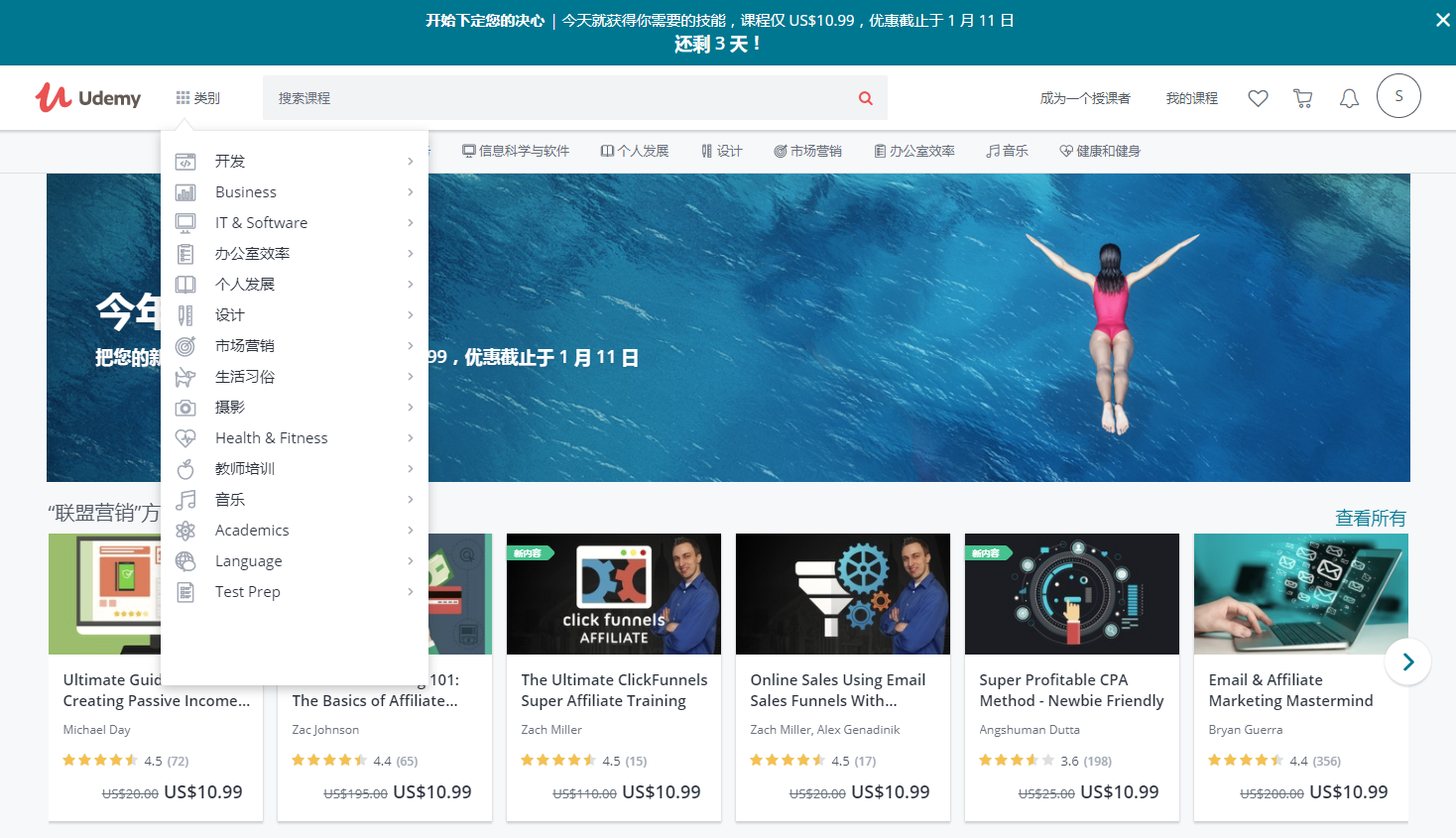 Udemy是一个非常棒的在线视频教育平台,学习成本很低,涵盖内容很广,适合那些希望增长或者新学习技能的职场人士或者IT人士。这是我少数几个我正在使用的付费学习的视频网站之一。支持中文,还是很棒的。