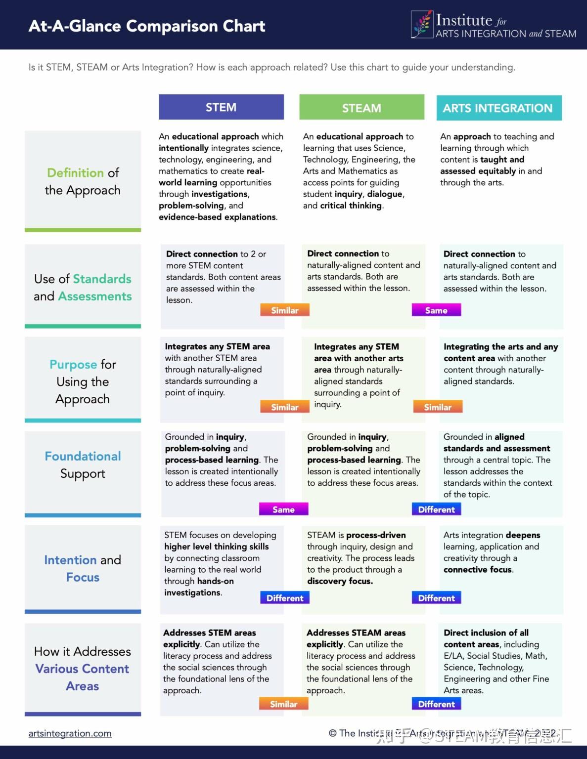 在深入研究此图表之前,重要的是要注意其中一种方法不会比另一种更好。尽管许多专家仍在争论STEM “应该”还是“不应该”演变成 STEAM,但这并不是重点。每种方法都有价值,并带来了集成工作的特定重点。