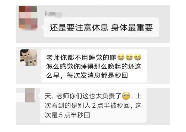 所以在无数个深夜、凌晨、周末、假期都可以看到我们老师的身影,凌晨回答学员问题的丁丁老师,深夜批改作业的胡子老师,以及无时无刻监督学习的助教老师,为此我们的学员还常常担心老师们的身体。