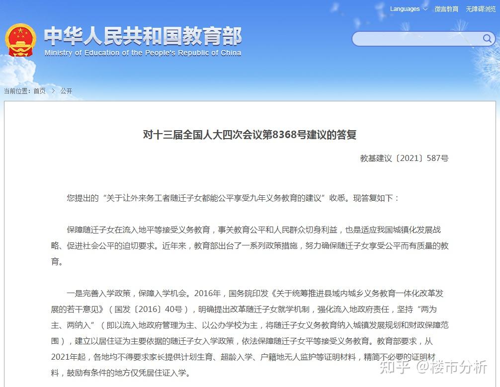 教育部官网公布了《对十三届全国人大四次会议第8368号建议的答复》,对“关于让外来务工者随迁子女都能公平享受九年义务教育的建议”进行了答复。