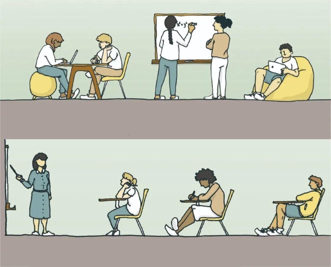 教室向学生传递一个强烈的信息,即他们来到教室听老师讲课并听从老师的指导。即使老师想改变模式,允许学生拼桌形成合作小组,教室的基本结构也保留了可掌控的性质,即一位成年人能够充分把控教室发生了什么、怎么发生、在哪里发生。