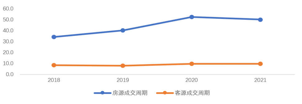 房客源成交周期仍高于疫情前。2021年全国重点40城房源成交周期为50.1天,同比缩短2.4天,相比于2019年延长9.9天,客源成交周期为9.7天,同比基本持平,相比于2019年延长1.9天。
