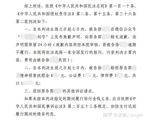 依照《中华人民共和国民法总则》第一百一十条,《中华人民共和国侵权责任法》第二条、第十五条、第三十六条第二款规定,北京互联网法院最终判决:被告徐某在其微信公众号发布致歉声明,向原告赔礼道歉,并赔偿精神抚慰金、律师费、公证费等各项费用。