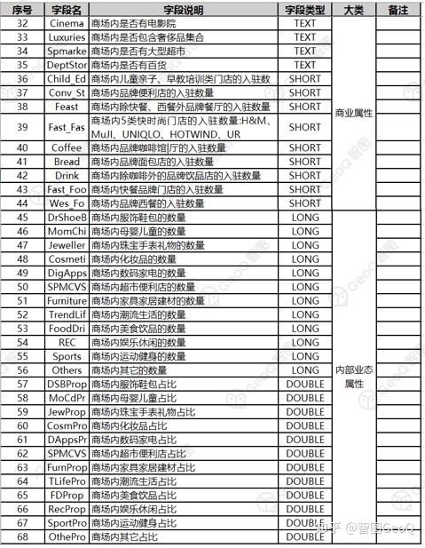 目前共68个商业地产相关属性字段,囊括了基础属性、增值基础属性、交通属性、人口客流属性、商业属性和内部业态属性六个方面。