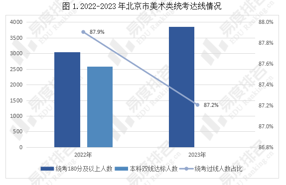 2023年北京美术类统考180分及以上人数有3851人,较去年上涨约27%,此次美术类统考人数上涨幅度较大,统考过线人数占比下降约0.7%;2022年美术类本科双线达标人数(美术类统考总分不低于180且其中2门科目各不低于60分,文化课成绩不低于艺术类本科线)为2588人,往年本科双线达标率均超70%,预计2023年北京美术类双线达标考生人数超3000人。