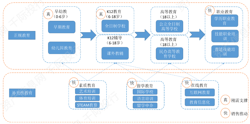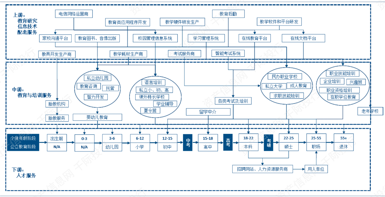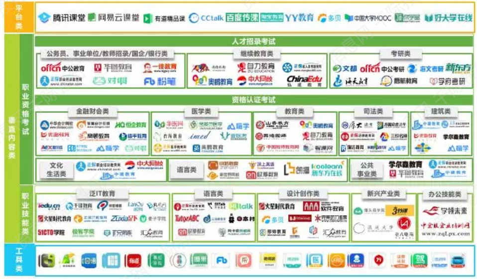 教育行业指以传播知识、培养人才为目的,以“传道授业解惑”为主要活动内容的事业。它不仅包括全日制的学校教育,而且包括半日制的、业余的学校教育、函授教育、广播电视教育和网络教育等。可以按照传统的既定教育时期分为早幼教,K12教育,高等教育和职业教育,按照商业模式不同可以划分为学历教育培训,素质教育培训,民办学校和留学教育等,按照形式的不同可以分为线下教育和在线教育。
