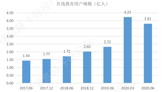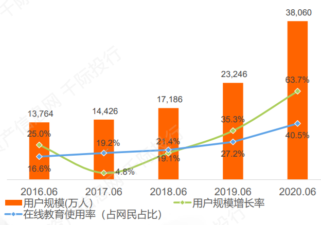 随着通信技术的进步,教育行业的模式更加多元化。在线教育行业自2017年起开始加速发展,用户增速逐年攀高,2019年下半年至2020年上半年期间,用户增长63.7%,在线教育用户规模占网民的40.5%,用户规模十分可观。其中K12在线教育规模在2020年达到了3亿人,较上年增长941.6%。