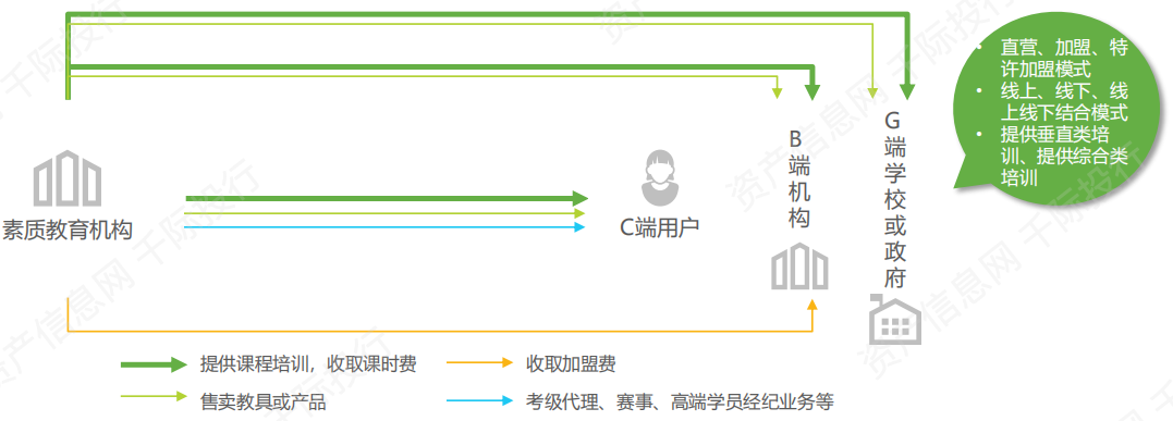 素质教育行业商业模式可简单分为2C、2B、2G。2C指面向学生和家长提供课程培训,或售卖教具产品,进行考级代理、组织赛事、提供经纪服务进行创收;2B指面向相关培训机构收取加盟费用,或提供课程培训、售卖教具产品等,教具产品往往跟课程课时捆绑出售;2G指面向公立学校提供课程培训、售卖教具产品等,瞄准的是学校或政府的素质教育经费。