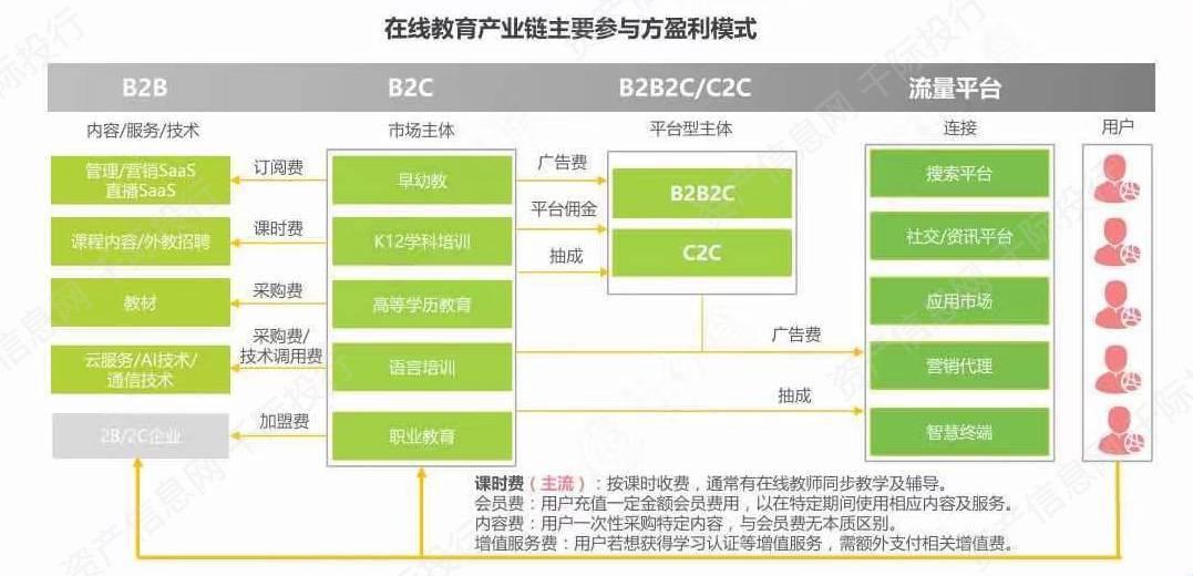 在教育行业的产业链中,技术服务商、和相关教育资源提供商是上游,其作为底层服务端,向中游的各类教育内容提供商、运营平台企业提供支持,并通过互联网流量渠道推广至下游的用户端。内容收费,咨询收费,软件收费,平台佣金和广告收费是当前教育行业的主要盈利模式。