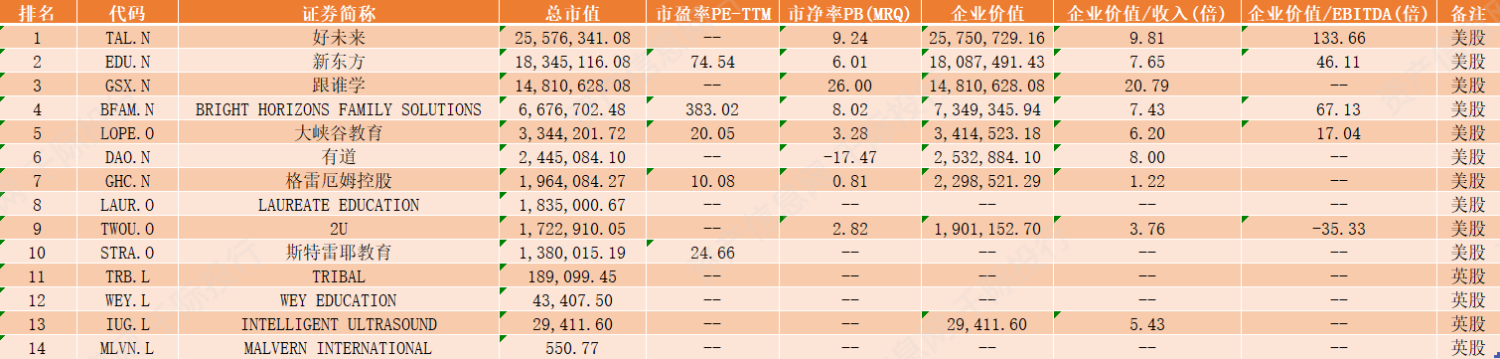 1) 新东方[EDU.N] :中国教育行业常年龙头企业,退出了新东方在线,提供大学教育、K-12 教育、学前教育和向机构用户提供教育产品的综合在线教育平台,是中国领先的在线教育服务提供商。