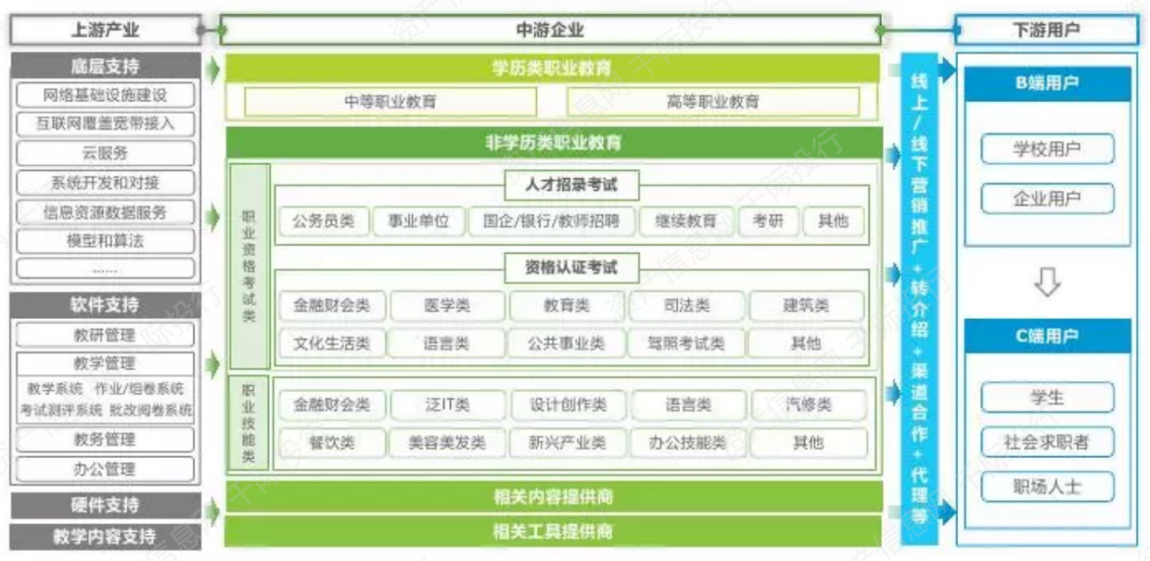 在线教育按照内容可分为职业教育,素质教育和留学教育几种主要赛道。在线职业教育的上游产业为中游企业提供技术和内容支持,中游企业作为内容提供商和平台运营商,为下游用户提供教学服务。