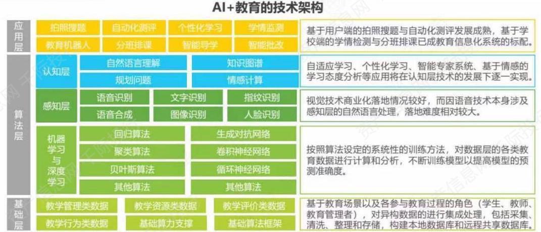 目前已有AI+教育的形式在市场上出现,AI技术将作用于教育教学的各个场景,例如基于情感分析的课堂表情捕捉,与基于语音语义识别的数据结构化处理,这些都将助力教育核心环节的数据采集与分析。从AI+教育的技术架构来看,可初步分为三个部分,即基础层、算法层、应用层,每一层分别表现出不同的特点。