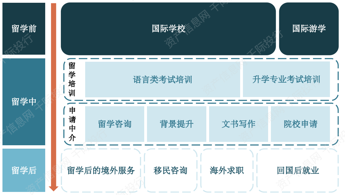 留学服务产业为出国留学人群提供留学相关的服务,覆盖学生出国留学的前、中、后各个阶段的各种需求。狭义的留学服务产业一般是指留学中提供留学培训与中介服务这一部分。而广义来讲,随着需求的不断延伸,在留学前,有从小学到高中长达 12 年的国际学校以及期间的游学服务;在留学后,也有在境外生活、工作以及归国后就业的相关服务,覆盖学生出国至归国后 1-2 年的时间。