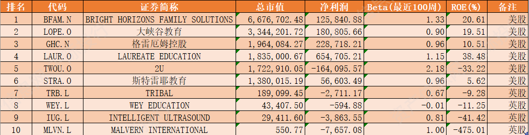 1) BRIGHT HORIZONS FAMILY SOLUTIONS[BFAM.N]:一家总部位于美国的儿童保育机构,是最大的儿童保育机构。它还提供孩子和老人的照顾,学费项目管理,教育咨询和学生贷款偿还项目。