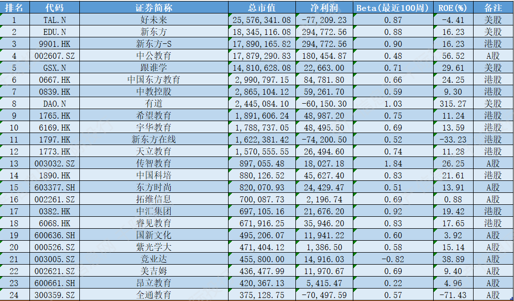 中国主要的上市公司有好未来[TAL.N]、新东方[EDU.N]、新东方-S[http://9901.HK]、中公教育[002607.SZ]、跟谁学[GSX.N]、中国东方教育[http://0667.HK]、中教控股[http://0839.HK]、有道[DAO.N]、希望教育[http://1765.HK]、宇华教育[http://6169.HK]、新东方在线[http://1797.HK]、天立教育[http://1773.HK]、传智教育[003032.SZ]、中国科培[http://1890.HK]、东方时尚[603377.SH]、拓维信息[002261.SZ]、中汇集团[http://0382.HK]、睿见教育[http://6068.HK]、国新文化[600636.SH]、紫光学大[000526.SZ]、竞业达[003005.SZ]、美吉姆[002621.SZ]、昂立教育[600661.SH]、全通教育[300359.SZ]等。