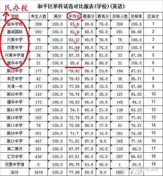 和平区的五所民办校全部排在前面,其中前四名的学校:益中学校(天津一中民办校)、嘉诚国际(耀华中学民办校)、兴南学校(第二南开民办校)、双菱中学(20中学民办校)的平均成绩比成绩最好的公办学校(20中学,79,.92分)高出了十几分!注意:这只是初一第一学期一个学科考试的成绩!