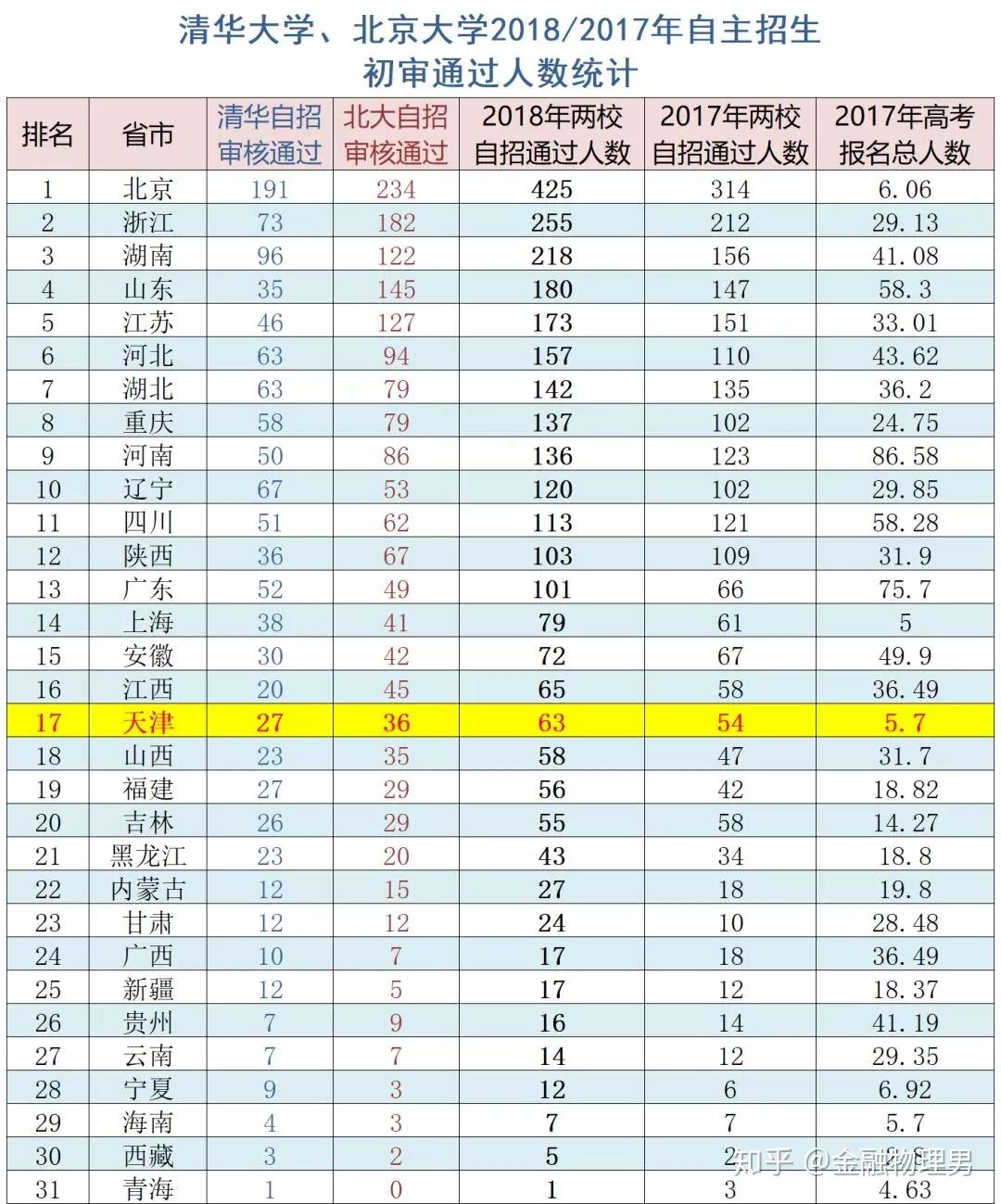 拿5月初发布的北京大学、清华大学2018年自主招生初审名单来说明,虽然天津入选总人数在全国位列中游,考虑到考生总数,这其实个比例已经非常高了。(仅低于北京和上海)