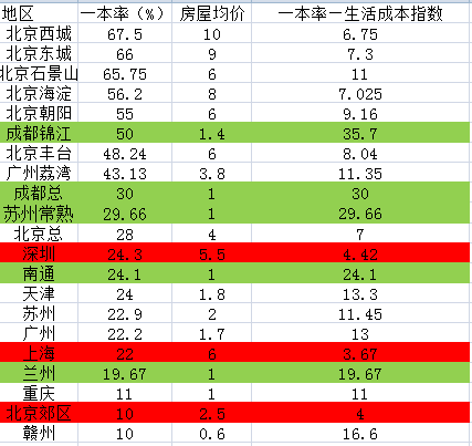 为了研究父母付出生活成本和孩子发展之间的关系,我创造了一个指数:房价——一本率指数,即把生活成本抽象为当地房价,把教育抽象为一本率。下面我随机搜取部分地区为大家提供参考。 总排列按一本率排列,绿色标注部分为指数>20的地区,红色<5的地区。北京郊区没有数据,不过市区一本率都过半了,我们就假设它为10%,跟全国平均相等。
