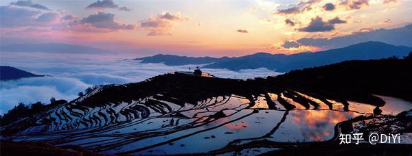 11.哈尼云海梯田:近万亩的梯田沿着高耸入云的哀牢山从山脚一直修到山顶,层层叠叠、埂回沟转、鳞次栉比,形成伸向云天的“天梯”。梯田随四季更迭换景,到了冬天,梯田云雾缭绕,变幻莫测,日出霞红之时,更加奇幻夺目。