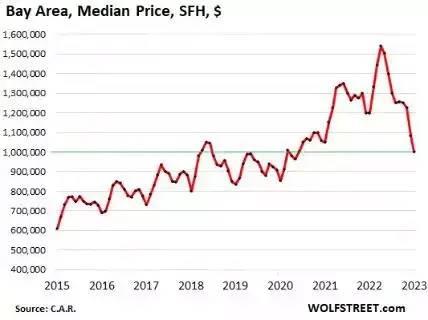 据加州房地产经纪人协会(California Association of Realtors)公布的最新数据,截至今年1月,在短短十个月之内,湾区房价中位数就已从顶点狂跌35%,从154万美元跌至100万美元。1月,湾区房价较去年同期下挫14.6%,创2009年7月以来的最大同比跌幅,销量方面,销售额环比暴跌38.1%,同比跌幅达36.9%。 目前美国通知粘性还比较大,美联储降息遥遥无期,如此高的资金成本下,美国房地产这波大涨也注定来去匆匆,最终会回归疫情前的水平。