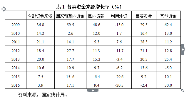 资金来源增长率明显放缓。近年来,投资资金来源增速的下降幅度明显高于投资完成额,与2009年相比,投资完成额增速下跌了74%,投资资金来源下跌了90%;与2013年相比,投资完成额增速下跌了50%,投资资金来源下跌了80%。除国家预算内资金保持相对稳定较快增长外,其他各类资金来源增速或大幅波动,或下降明显。国内贷款增速由高峰时的48.6%回落到不足10%,其中,2015年甚至下降了6.4%;利用外资下降幅度最大,2012年以来增速连年下滑;自筹资金增速下滑趋势也非常明显,其中2016年下降2.4%;其他资金增速则波动较大(见表1)。