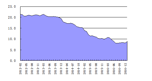 投资进入了低速增长时期。随着经济进入新常态,我国全社会投资增速逐年回落,已由2012年的20%下降到2016年的7.9%,降幅较大。投资对GDP的贡献率由2014年的135%下降到2016年的76%,下降了近一半。月度累计投资增速从2012-2013年的20%左右下降到2014年的17%左右,再下降到2015年的10%左右和2016年的8-9%,几乎是每一两年下一个台阶。2016年,当月投资增速由由年初的10.2%迅速下降到年底的6.5%,其中,7月份增速只有3.9%,达到近十年最低。2017年1-2月份,全国固定资产投资增速达到8.9%,同比下降了1.3个百分点(见图1)。